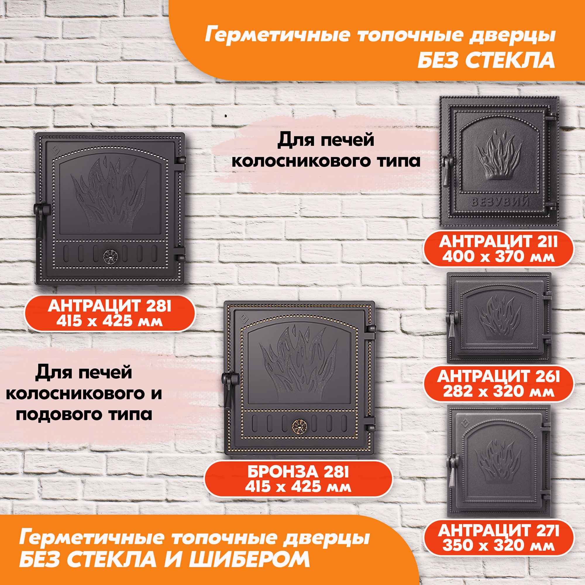 Для придания более привлекательного внешнего вида все представленные у нас модели дверок для печей и каминов окрашены жаростойкой краской цвета «Антрацит» или «Бронза» производства ПТК «Везувий».