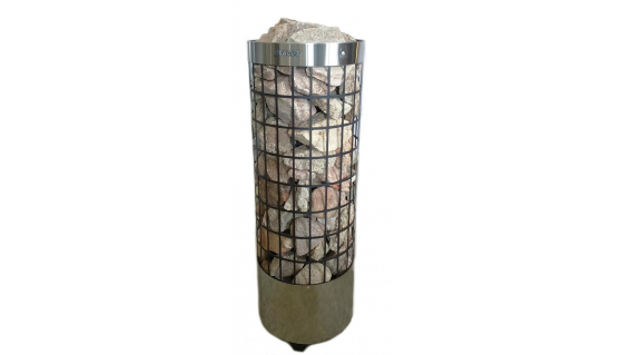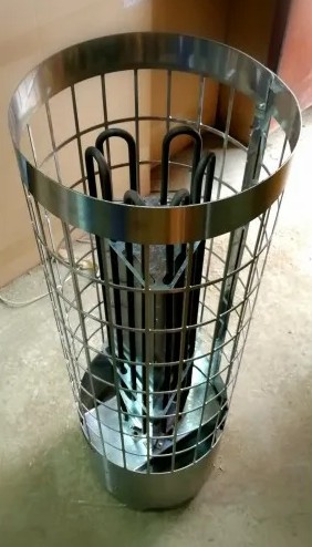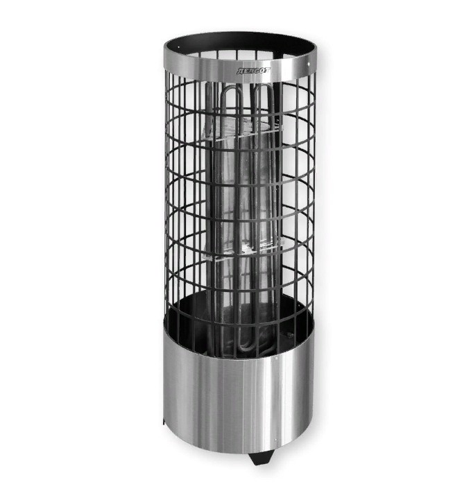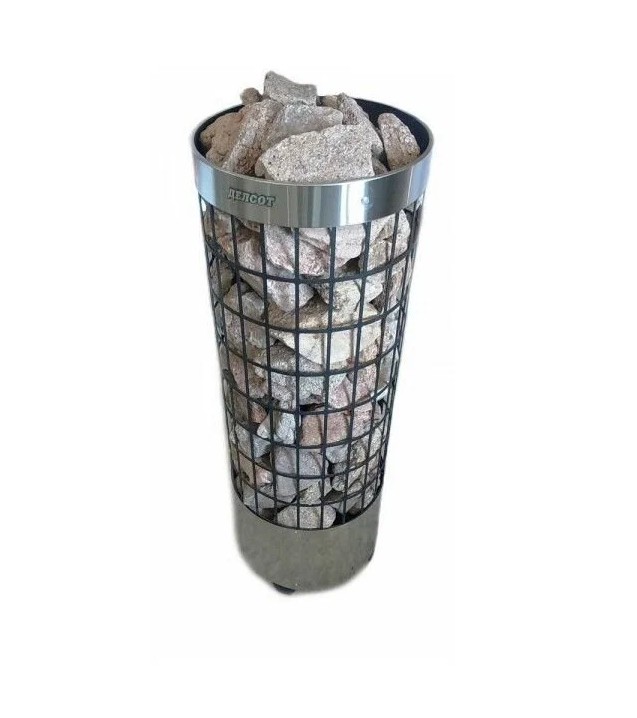 Особенности: цилиндрическая форма с прямоугольными вырезами на всей поверхности (конструкция в виде сетки), что обеспечивает комфортные условия нагрева помещения. Можно регулировать характер тепла от мягкого до сильного: достаточно плеснуть воды на боковую часть каменки или прямо сверху на камни.