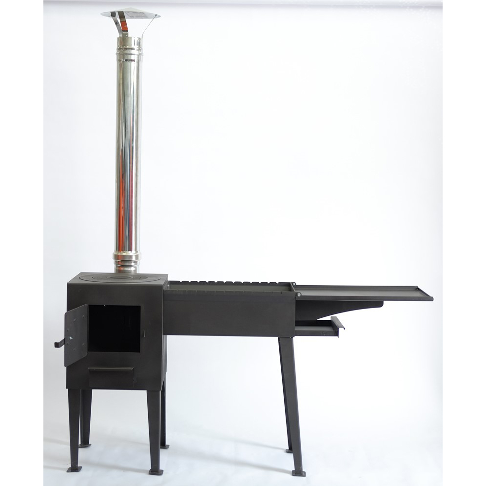 Металлический мангал отлично впишется не только на даче, но и в загородном доме, и может использоваться в качестве летней кухни, благодаря стальной конфорке казана можно с легкостью вскипятить чайник или приготовить любое блюдо, как на дровяной печи с варочной панелью.