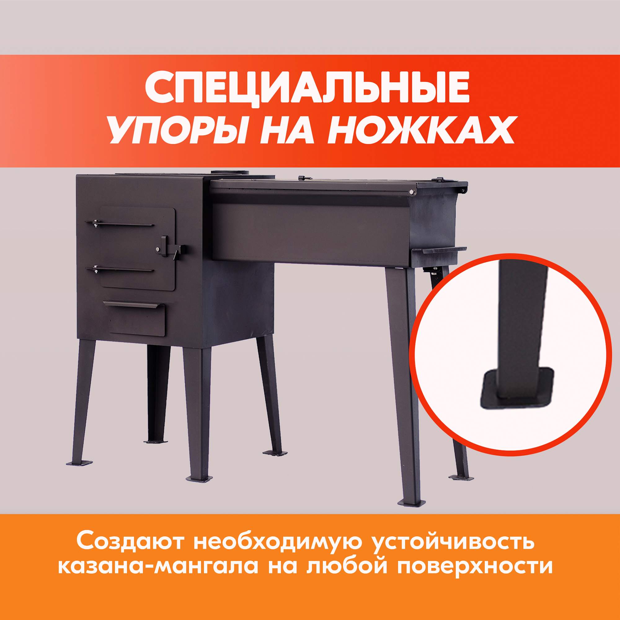 Ножки печи оснащены специальными упорами, создающими необходимую устойчивость на любой поверхности.