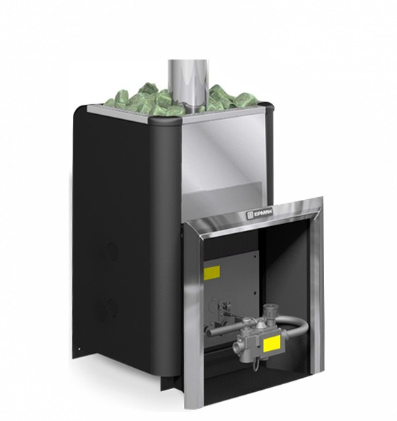 -Мощная горелка (16 кВт) с энергонезависимой автоматикой регулирования и безопасности. С возможностью работы на пропане, при установке дополнительного комплекта жиклеров (опция). Работает в автоматическом режиме по заданной температуре в парилке (+70 .. +120 °C).