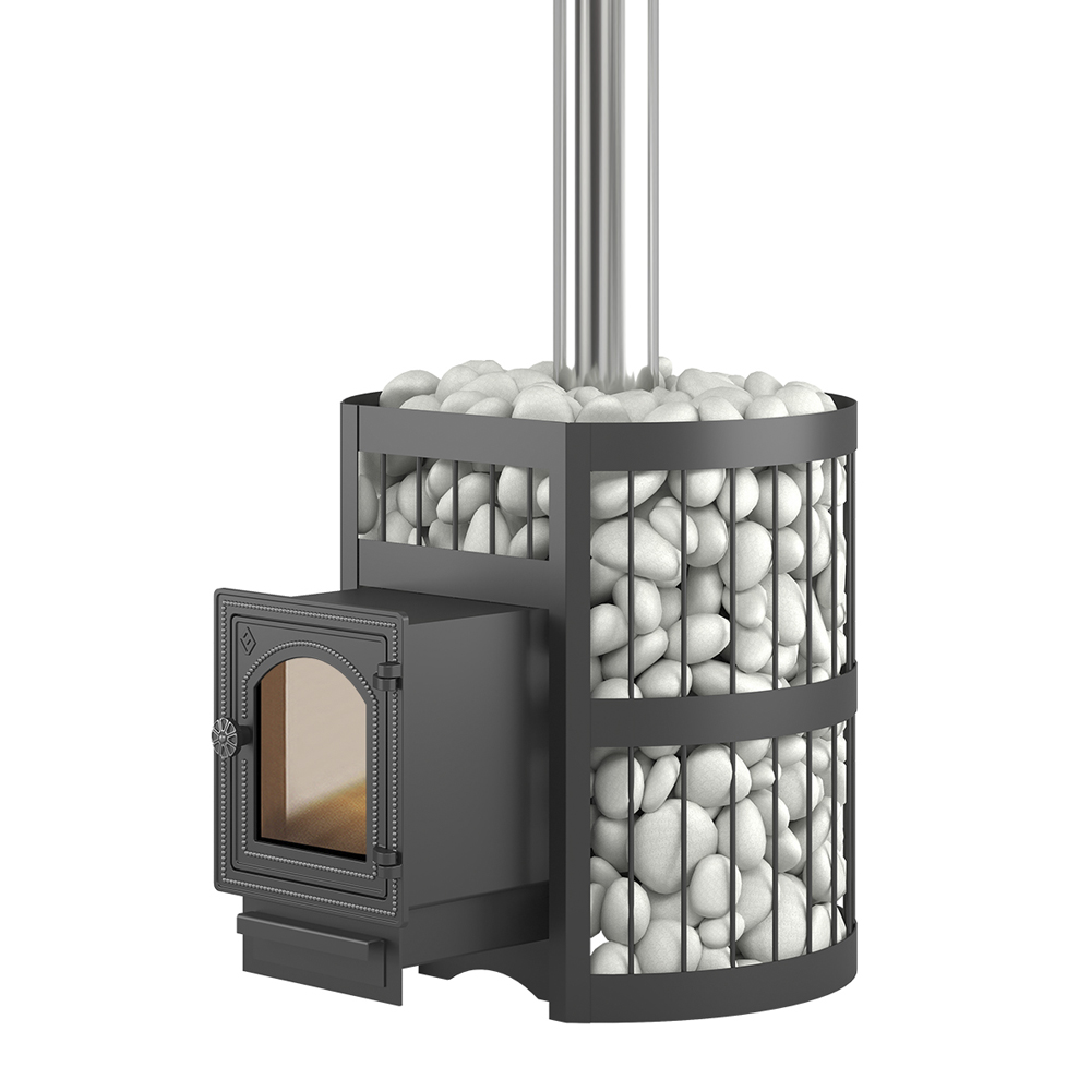 Пространство между печью и сеткой заполняется камнями для бани, которые выполняют роль теплонакопителя, перераспределяют тепло от стенок топки. Воду подают на нагретые камни, с которых полученный пар распространяется по всему объёму парной. Кожух диаметром 560 миллиметров вмещает в себя до 120 килограммов камней крупной и средней фракции.
