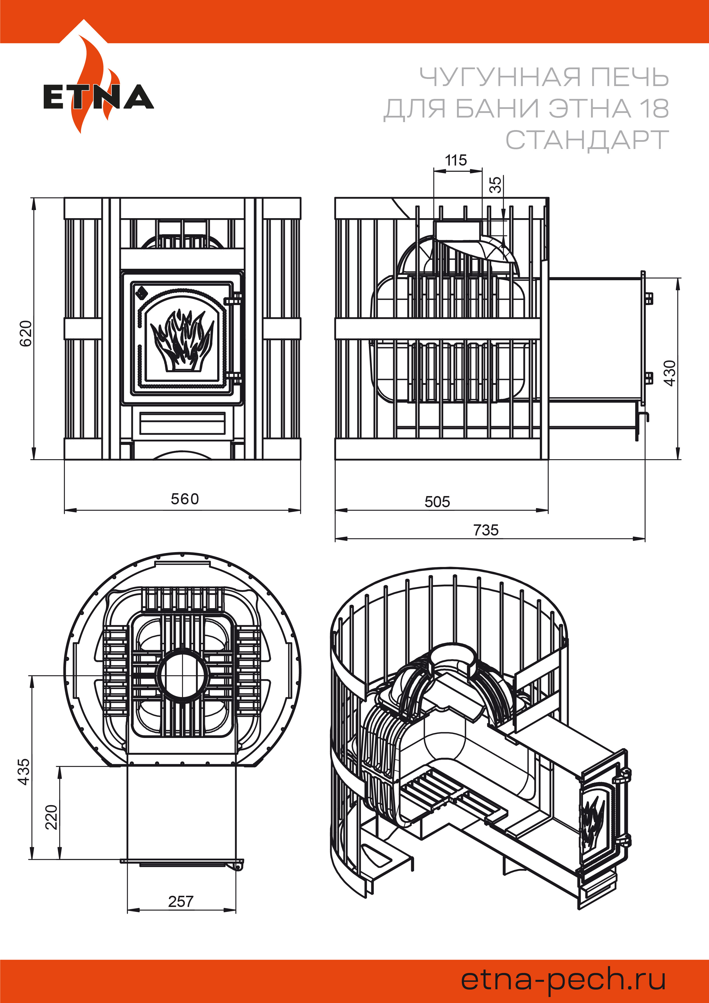 Чугунная банная печь ЭТНА 18 (ДТ-4С) оснащается  чугунной дверкой ДТ-4С и рассчитана на работу в парной объёмом до 18 кубических метров. С помощью этой модели обеспечивается быстрый равномерный прогрев парной, поддержание необходимой температуры и получение достаточного количества пара.