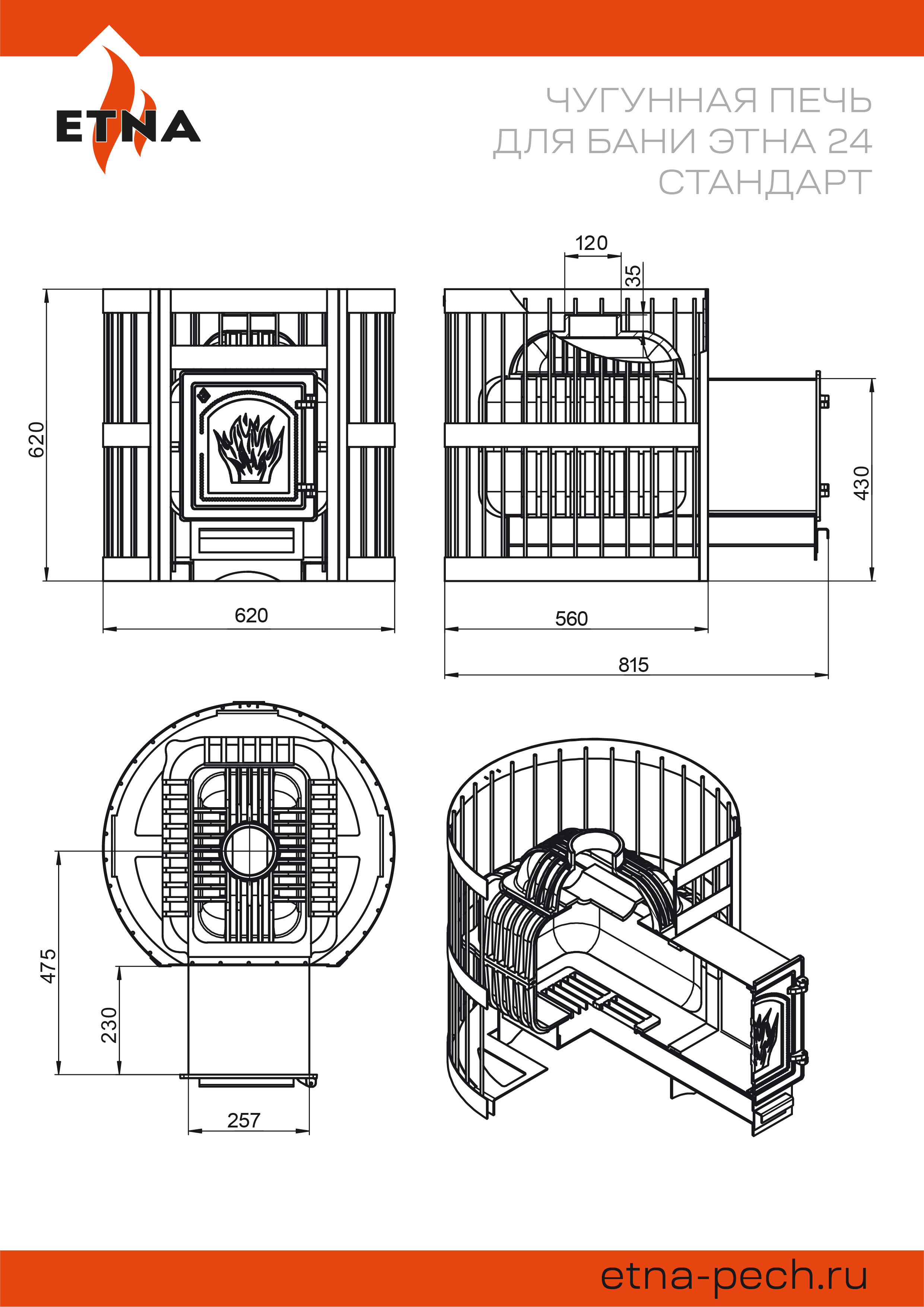 Банная печь ЭТНА 24 ДТ-4 изготовлена из чугуна высокого качества. Материал с высокой теплопроводностью, чугун быстро передаёт энергию сжигаемого топлива наружу, в пространство парной. Толщина деталей корпуса составляет 6-8 миллиметров.
