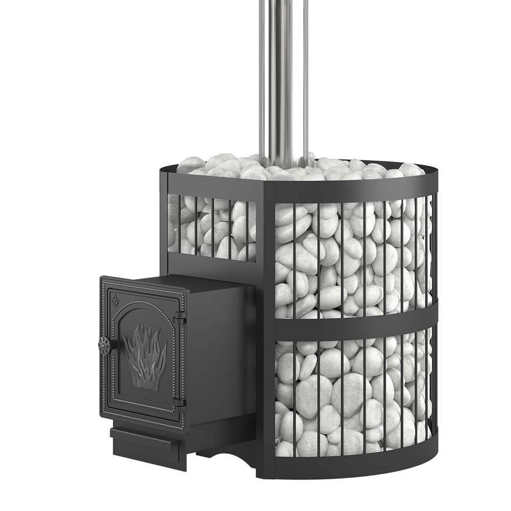 Для устройства наружной открытой каменки печь ЭТНА 24 оснащается металлическим кожухом с прорезным рисунком оригинального дизайна. Пространство между печью и кожухом из двухмиллиметровой стали заполняется камнями для бани, которые выполняют роль теплонакопителя, перераспределяют тепло от стенок топки и защищают парящихся от жёсткого инфракрасного излучения. Воду подают на нагретые камни, с которых полученный пар распространяется по всему объёму парной. Кожух диаметром 560 миллиметров вмещает в себя до 150 килограммов камней крупной и средней фракции.