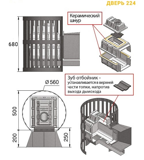 Банная чугунная печь Легенда ковка 22 (244) укомплектована чугунной герметичной, самоохлаждаемой дверцей Везувий 244 с жаропрочным стеклом «SHOT ROBAX», с оборудованной системой самоочистки, и  конвекционно-вентилируемый кожухом "КОВКА". В конструкции данной печи предусмотрен топочный тоннель длиной 200 мм, при помощи которого печь топится из соседнего помещения, смежного с парильным