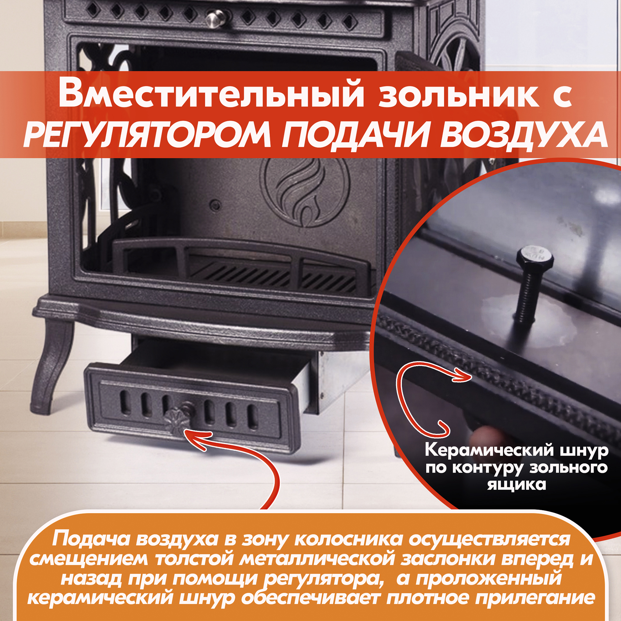 Благодаря конструктивным особенностям чугунной печи-камина достигается высокий уровень теплоотдачи при небольшом расходе дров.