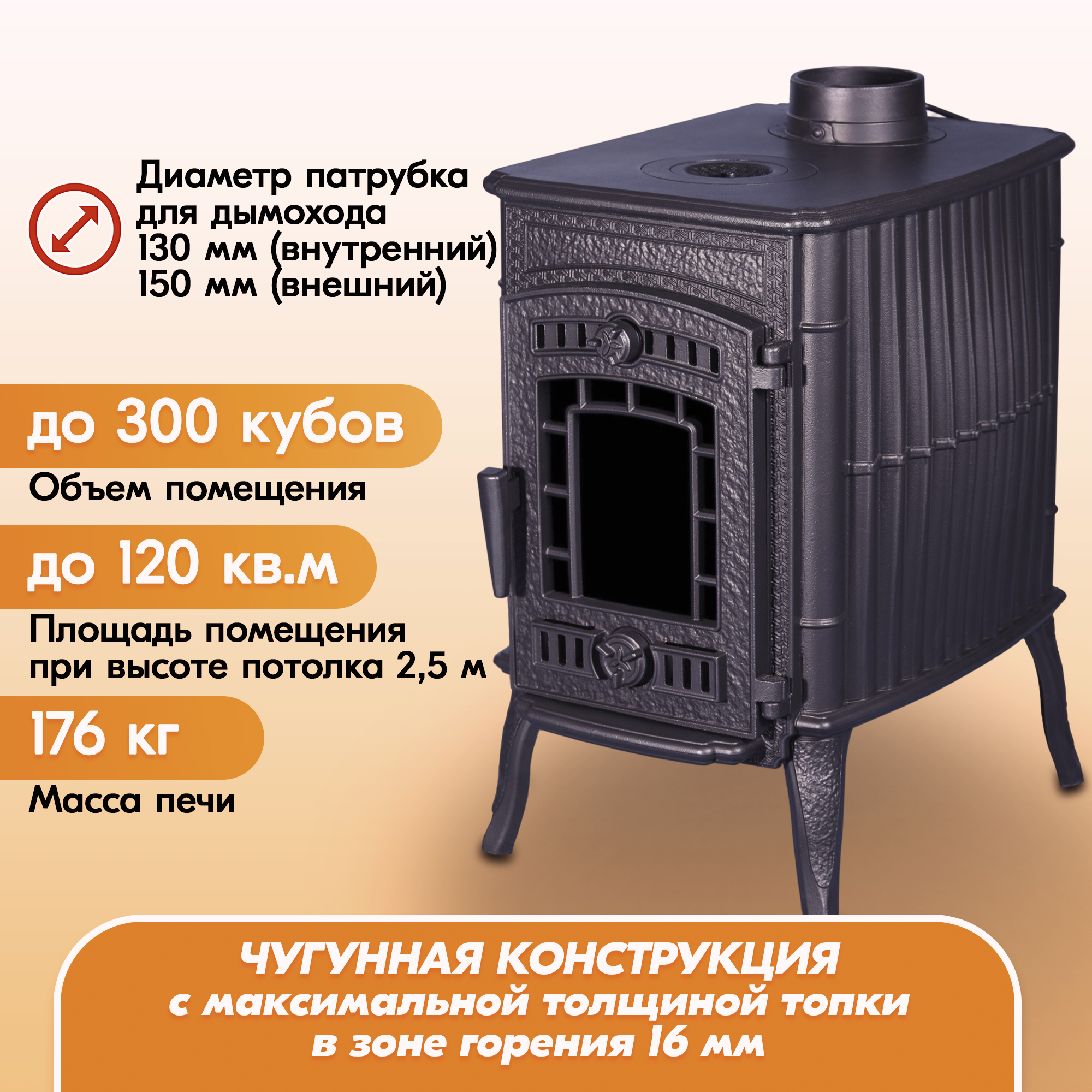 Чугунная печь-камин «Маэстро» отличается современным дизайном и высокой мощностью 15 кВт, способна достаточно быстро обогреть помещение объемом до 300 куб.м или площадью 120 кв. м при высоте потолка 2,5 м!