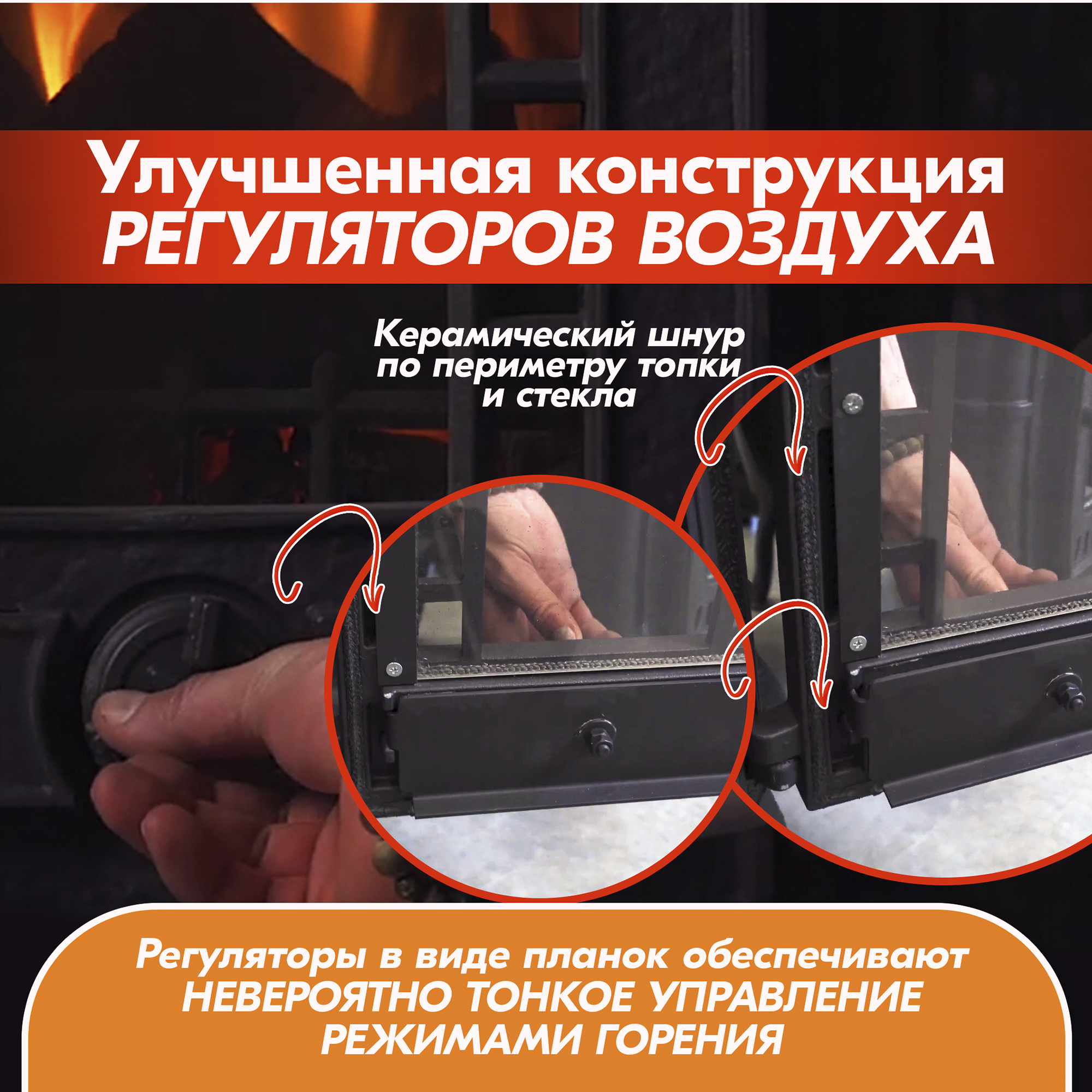 В печи-камине «Маэстро» реализована усовершенствованная конструкция регуляторов подачи воздуха, как для системы «Чистое стекло», так и для подачи воздуха в зону колосника.