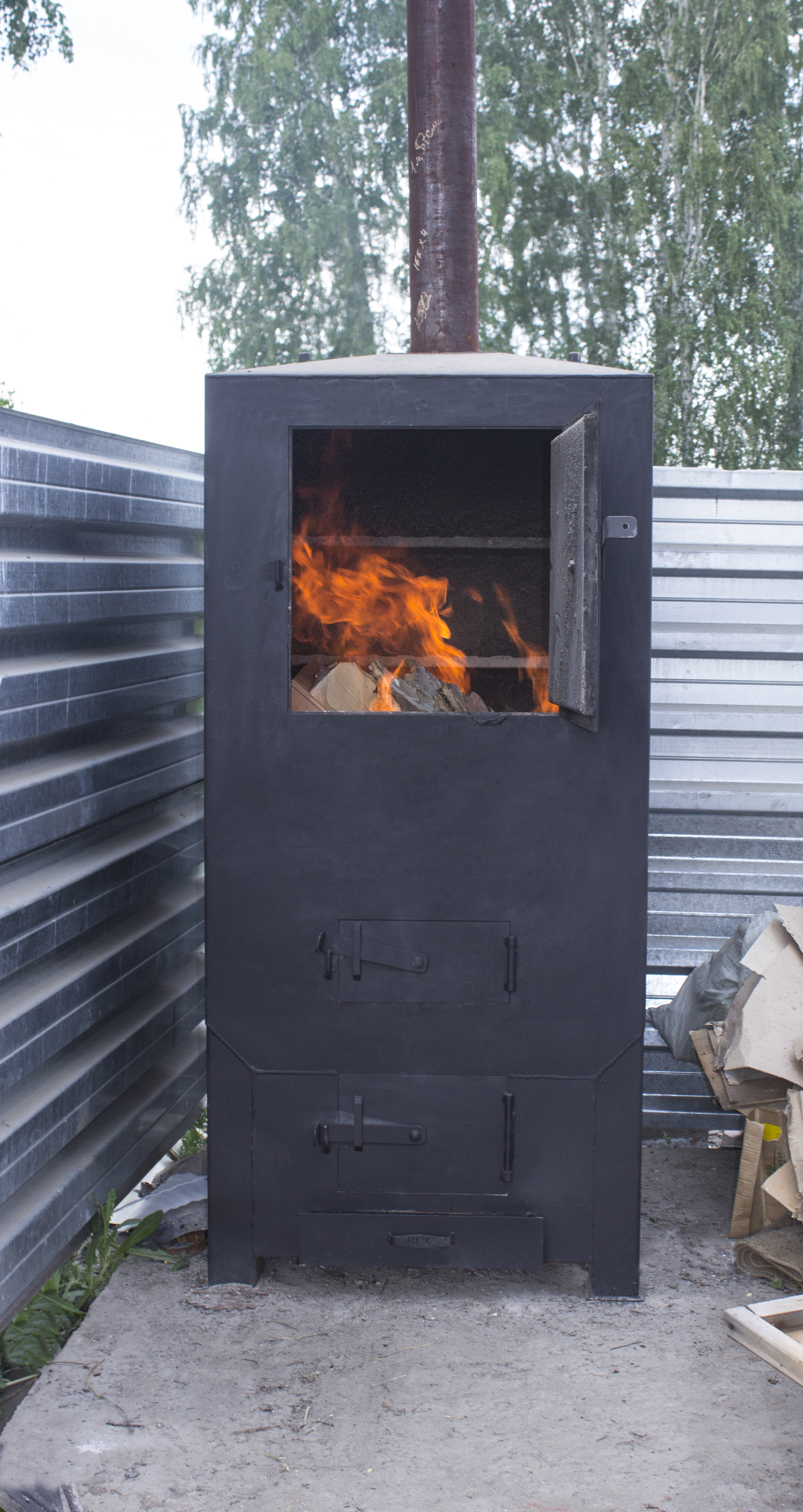 Печь изготовлена из стали марки СТ3СП5, окрашена двумя слоями термостойкой краски, что делает ее пребывание на приусадебном участке максимально гармоничным. Толщина стенок печи составляет 4 мм, что делает использование данной печи долговечным и надежным.