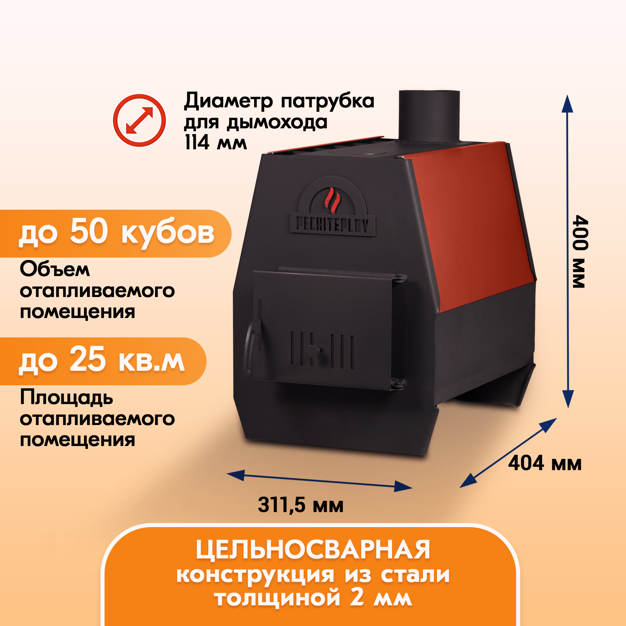 Печи отопительные PECHITEPLOV на 50 и 80 кубов, имеют компактные размеры и небольшую массу, поэтому их легко переместит с места на место и смонтирует один рабочий.