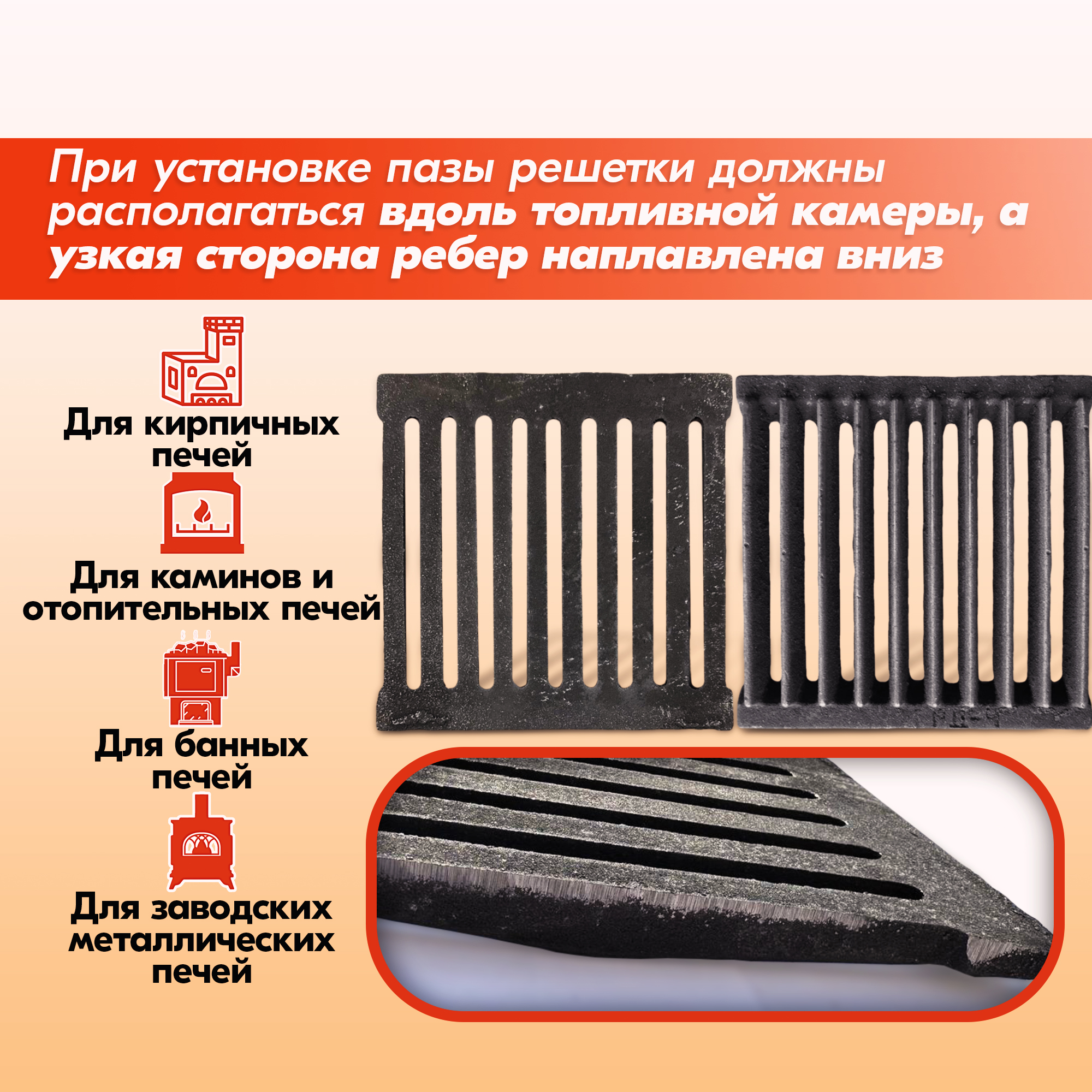 Обращаем внимание, что колосниковая решетка из чугуна РУ-7 — это 1/2 колосниковой решетки для угля РУ-2 и предназначена для укладки с решеткой РУ-2 в увеличенные по ширине топки печей размером 300х300 мм и больше.