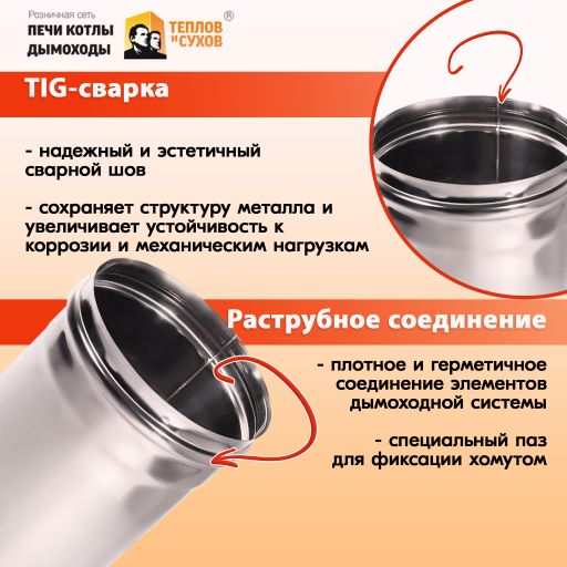 На каждой дымоходной трубе Теплов и Сухов имеется полная информация – наименование, марка стали и толщина металла, область применения.
