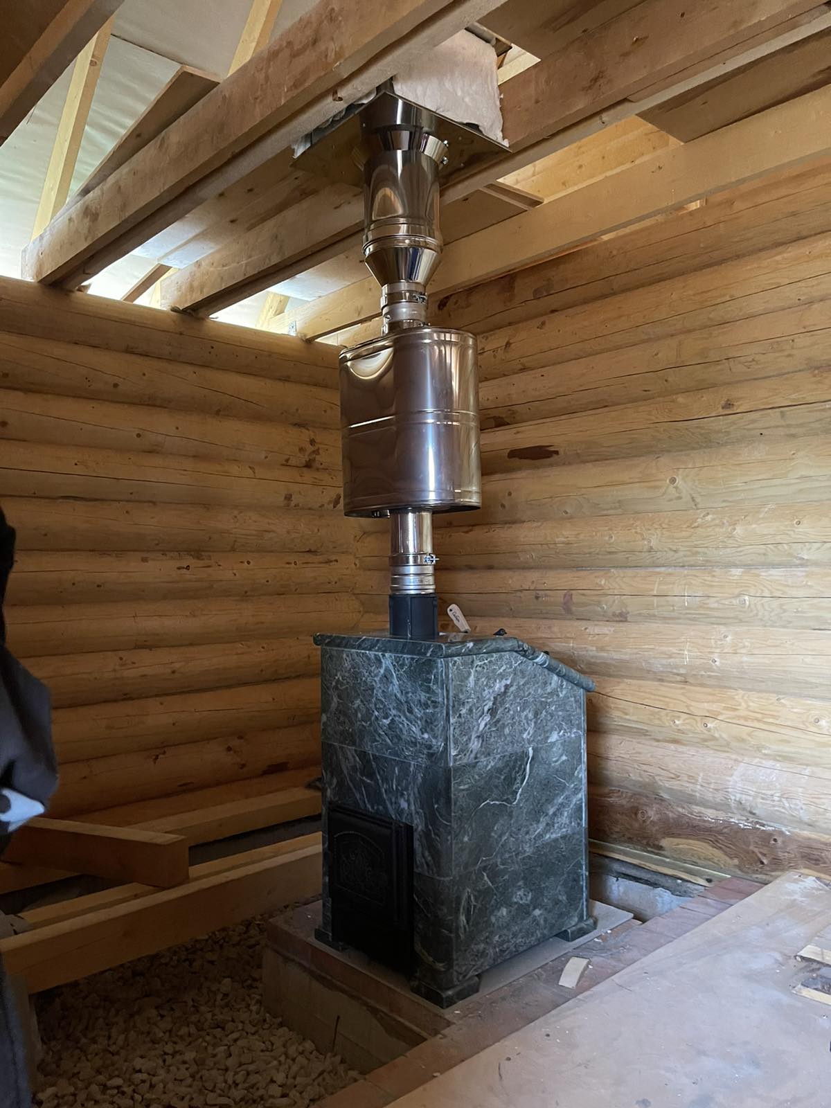 Монтаж банная печи НМК Сибирь 25 с закрытой каменкой в облицовке "Президент"
