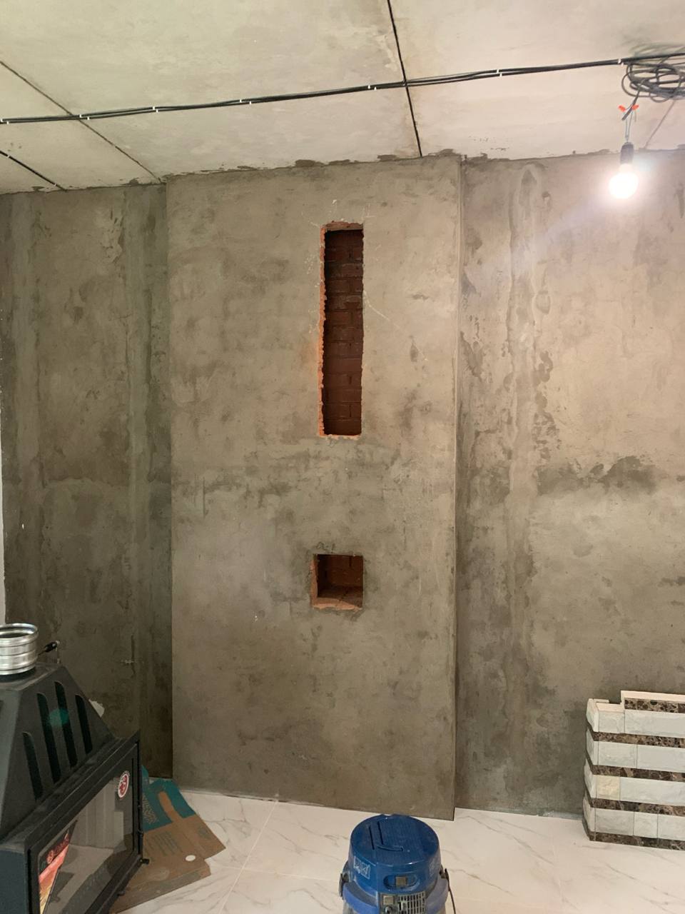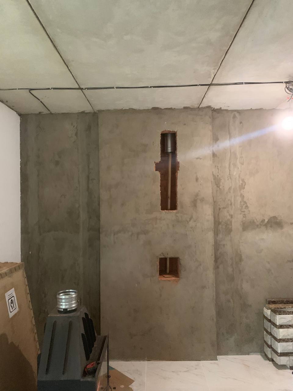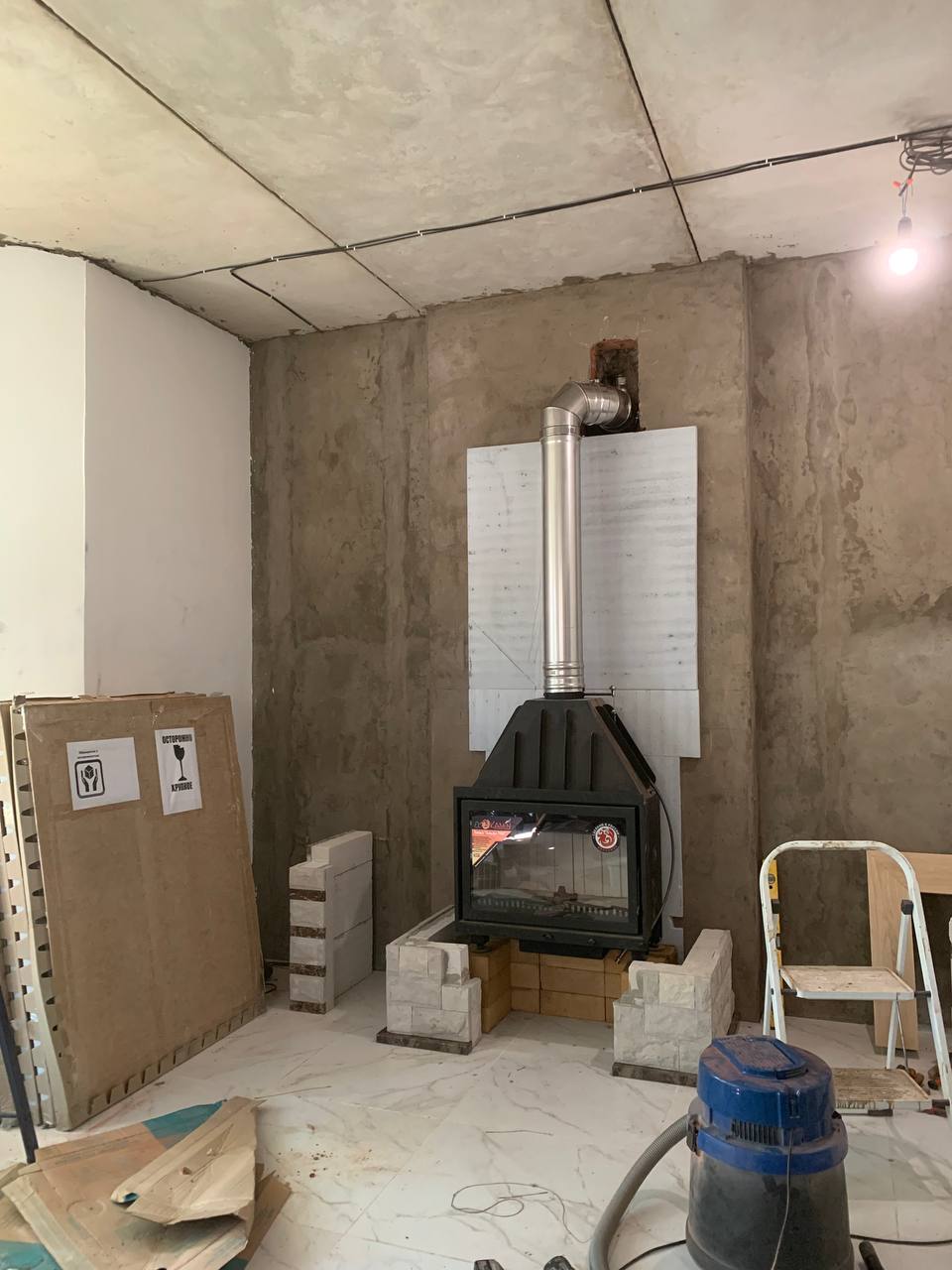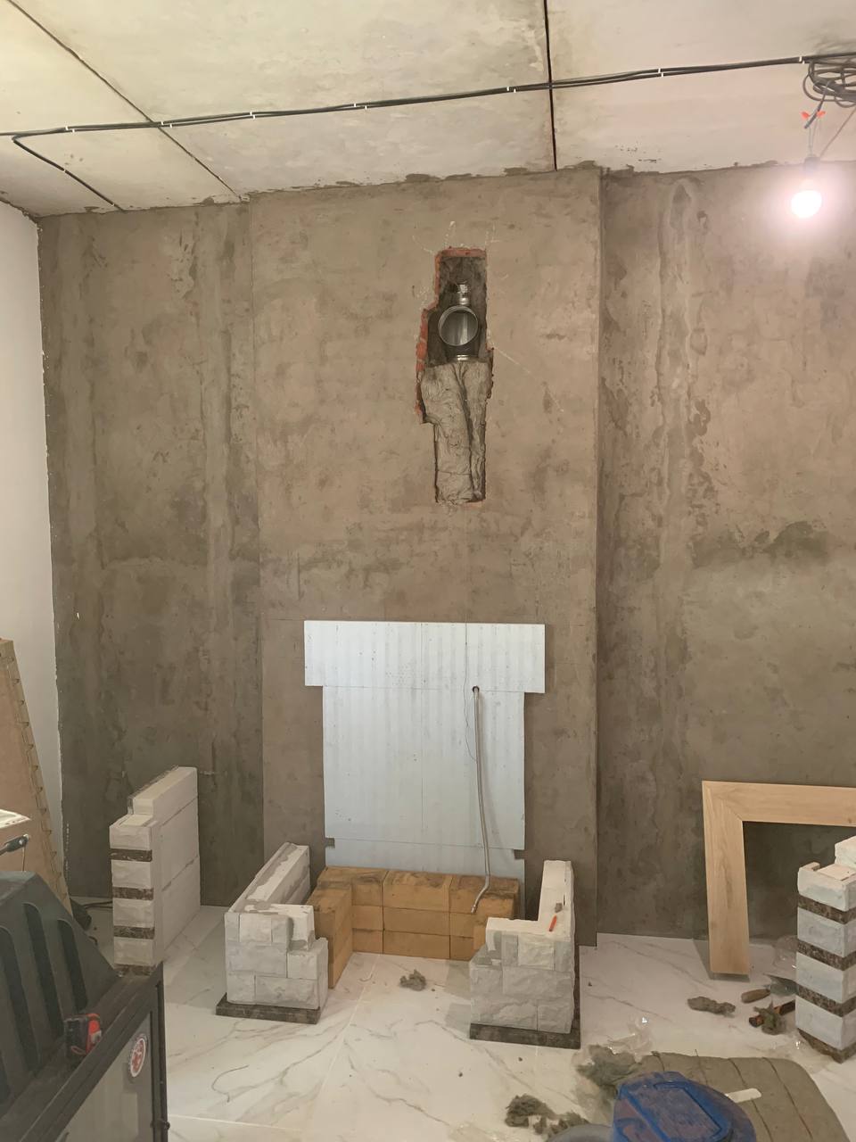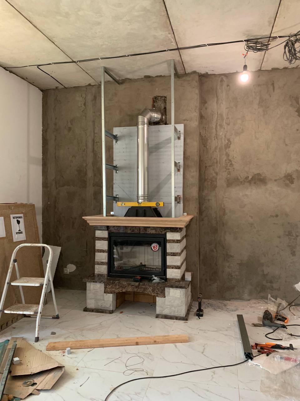 Установка Каминной топки, облицовки и монтаж дымохода через стену